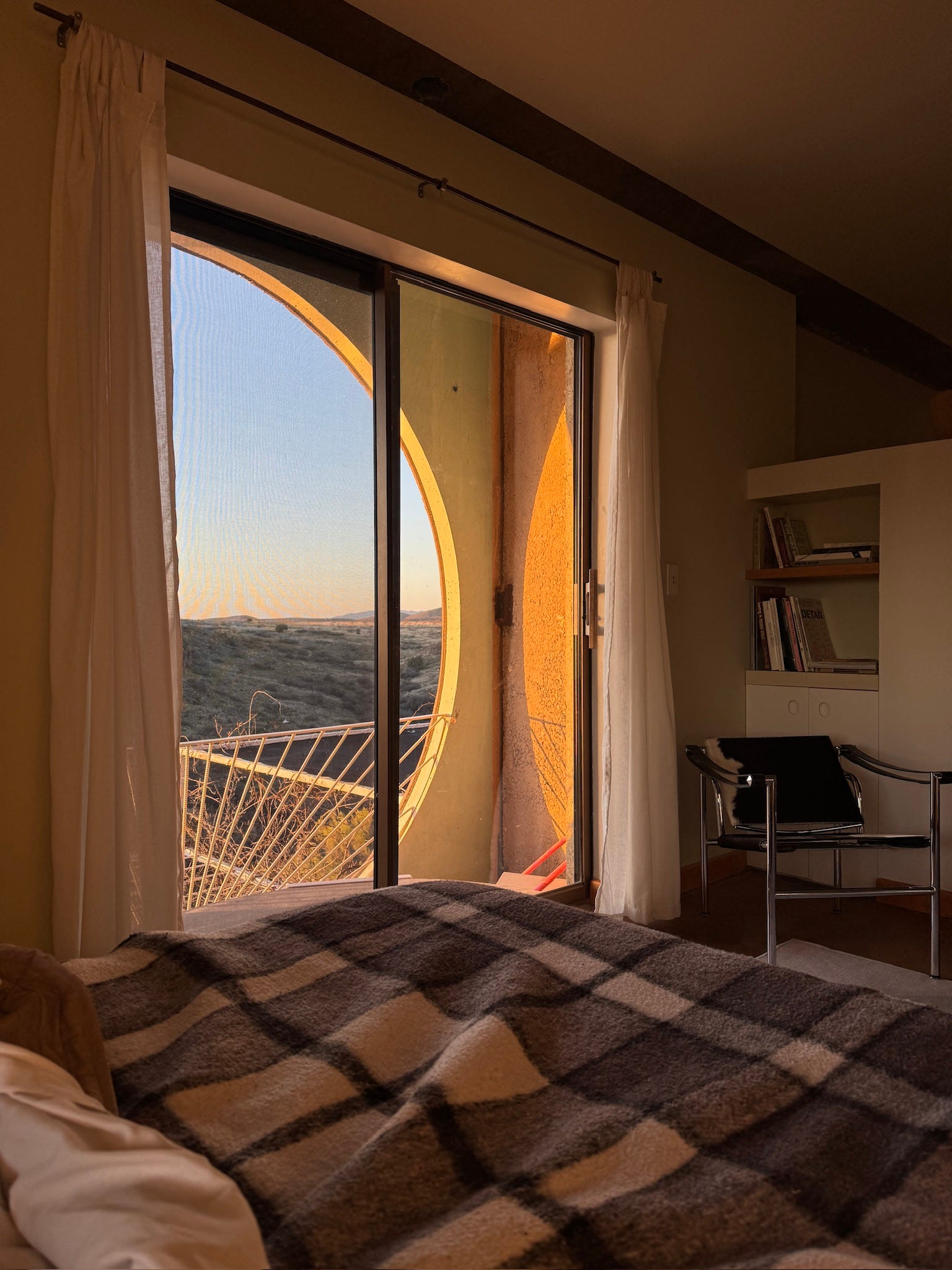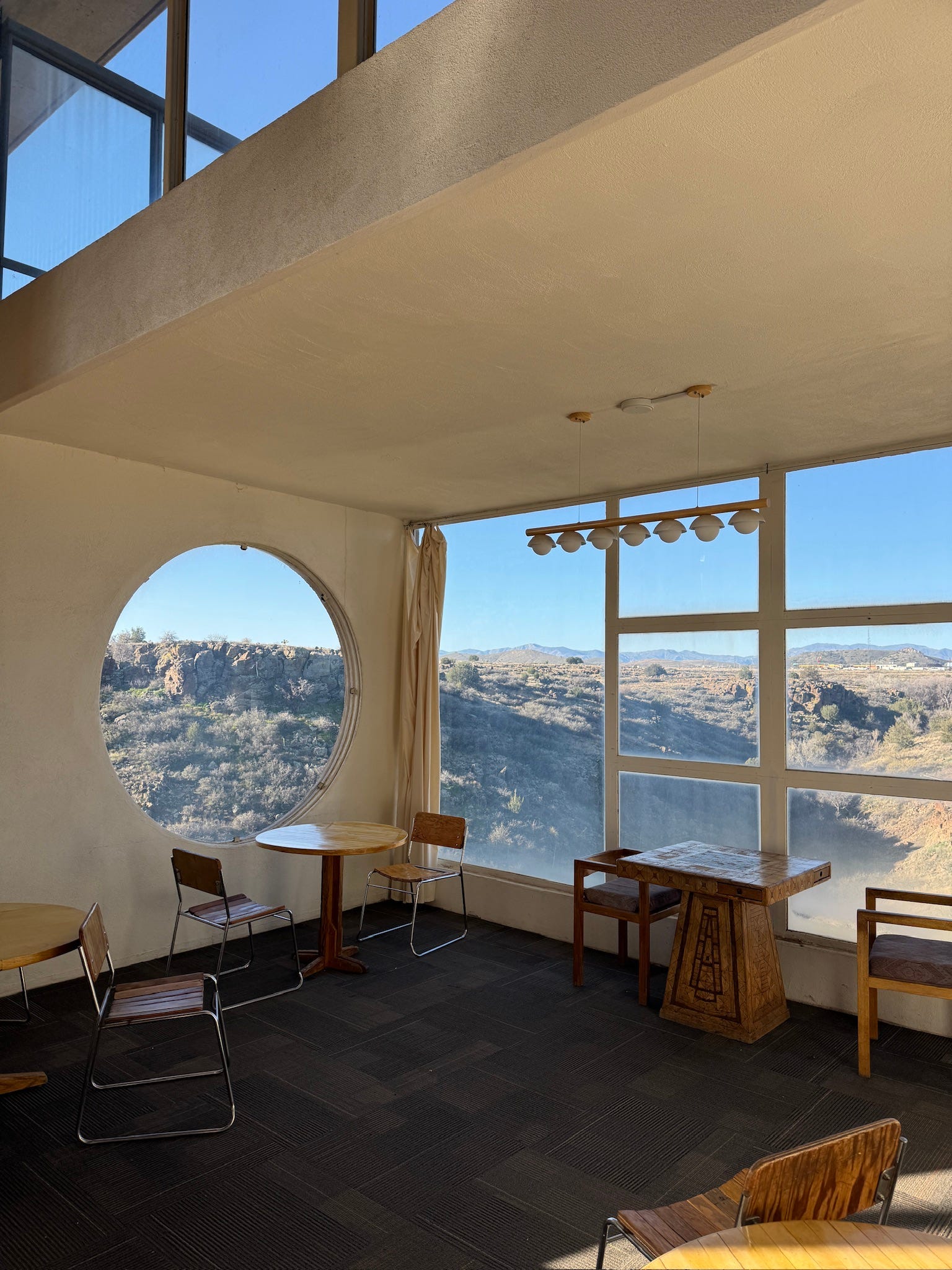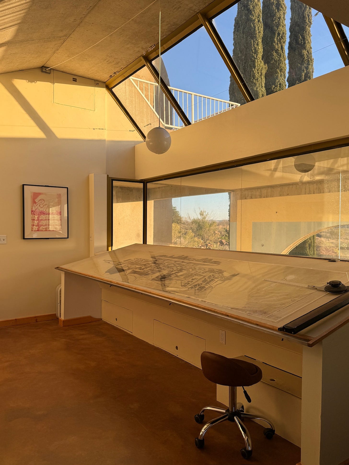 The drive in from the highway is unceremonious: exit just past a Love’s gas station and make your way down a winding dirt road until the compound materializes out of the landscape, the concrete structures landing somewhere between Mad Max and utopia. I arrived just after sunset, the sky still slightly aglow but dark enough to feel grateful to loosely know the way from my previous visit. After some bumbling around, I found my quarters: the Sun Suite, originally built as a studio for Soleri himself. The apartment features his original 16-foot drafting table, positioned in an atrium overlooking the desert, a kitchenette with spectacular curved wood counters, and a patio with views of the Agua Fria River valley.