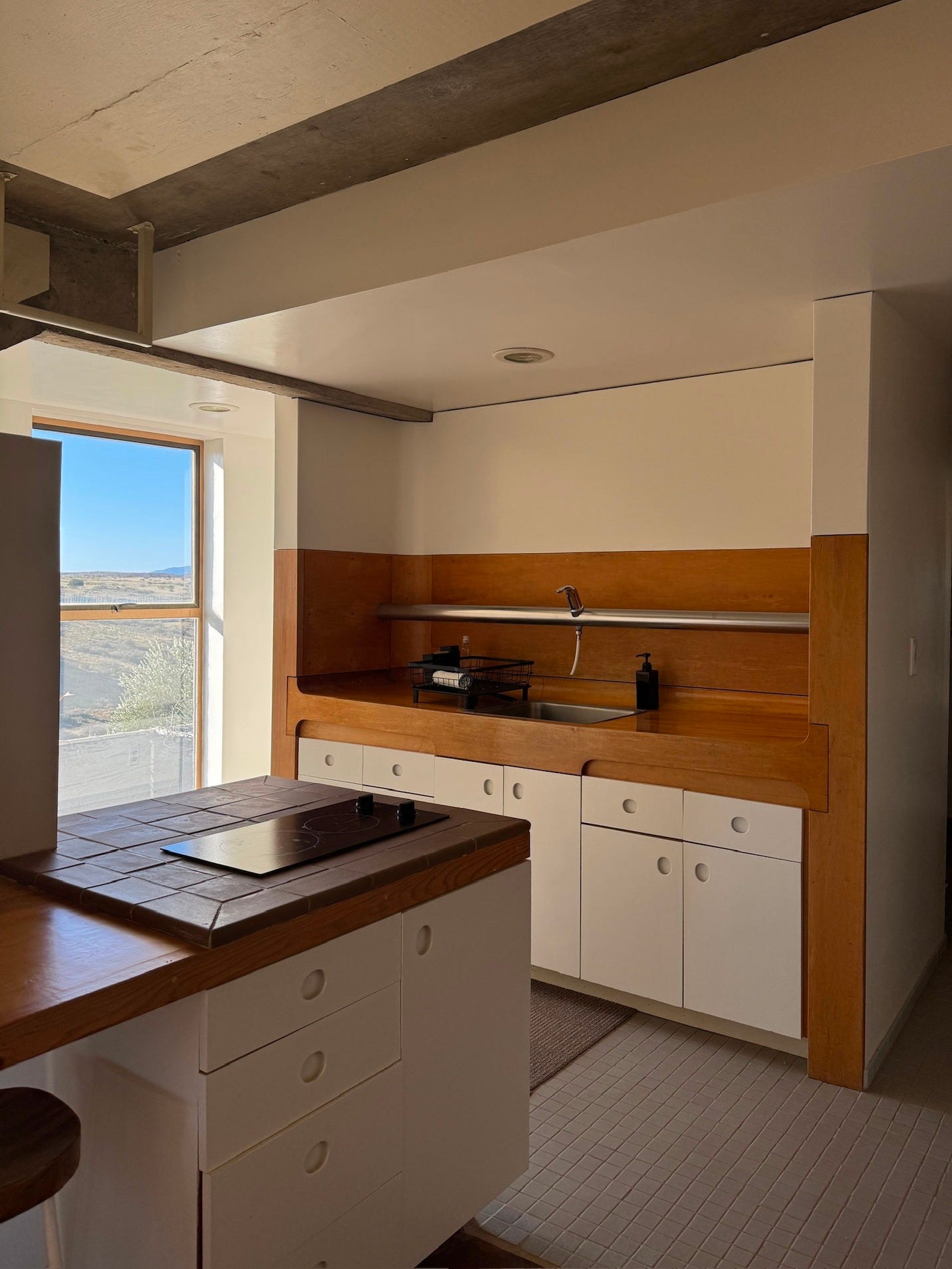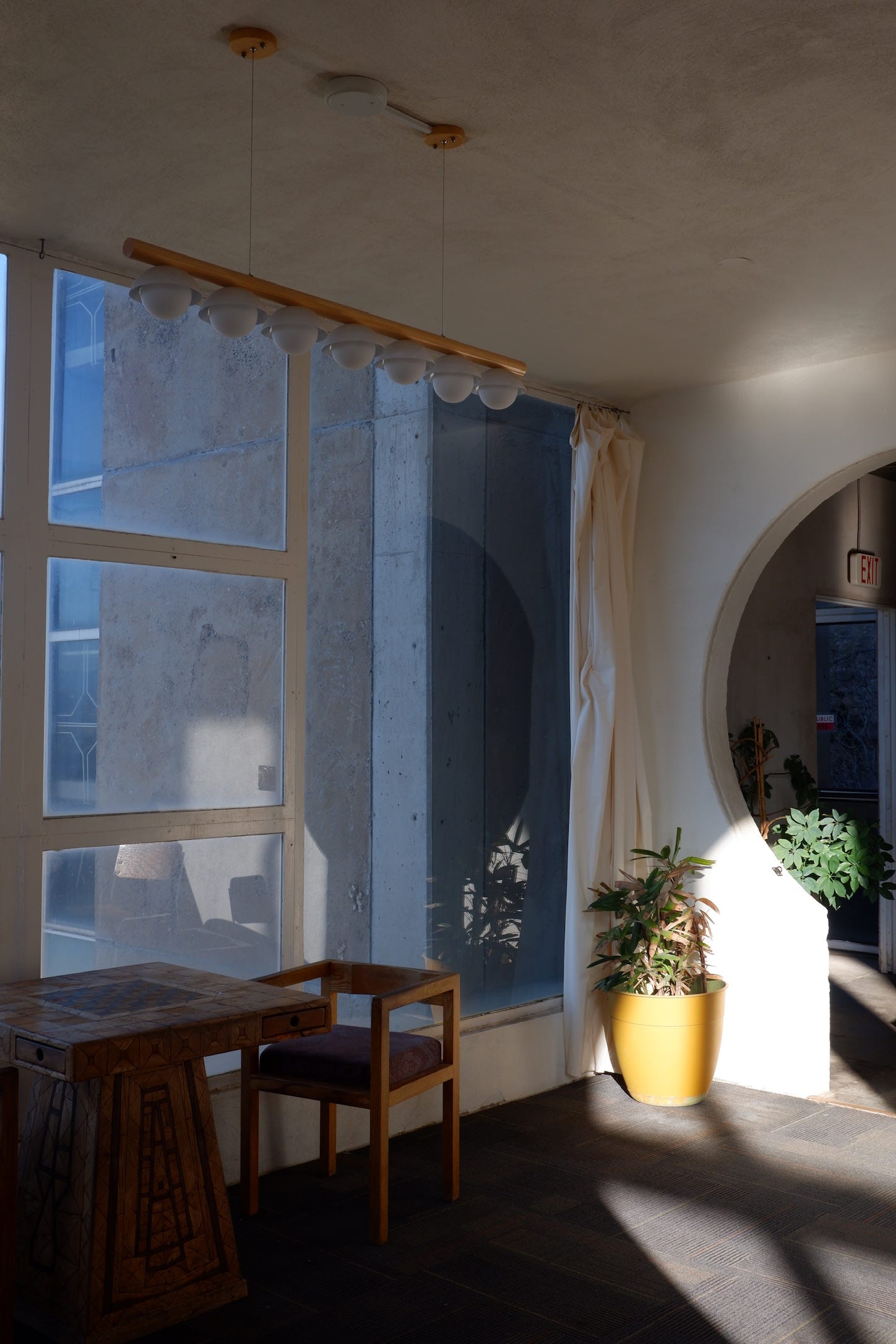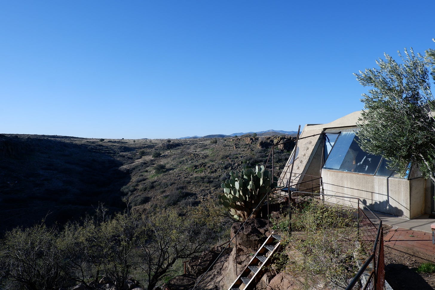 The drive in from the highway is unceremonious: exit just past a Love’s gas station and make your way down a winding dirt road until the compound materializes out of the landscape, the concrete structures landing somewhere between Mad Max and utopia. I arrived just after sunset, the sky still slightly aglow but dark enough to feel grateful to loosely know the way from my previous visit. After some bumbling around, I found my quarters: the Sun Suite, originally built as a studio for Soleri himself. The apartment features his original 16-foot drafting table, positioned in an atrium overlooking the desert, a kitchenette with spectacular curved wood counters, and a patio with views of the Agua Fria River valley.
